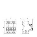 Formato modulare 4 unità, fissaggio su guida profilata, montaggio in qualsiasi posizione. Morsetti combinati superiori e inferiori, connessione con conduttori rigidi o multifilari 0,75–35 mm² e flessibili con estremità preparata 0,75–25 mm², coppia di serraggio 2,5–3,5 N·m. Dimensioni 90 x 72 x 76 mm, profondità di incasso 70 mm.