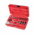 Nr. 11 chiavi a bussola da 1/4': e 3 da 3/8': Cricchetto reversibile da 3/8' con impugnatura in gomma, prolunga 3/8', adattatore 1/4'-3/8',rotella - Componenti in acciaio cromo vanadio.